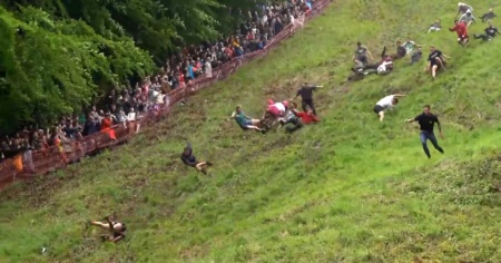 In decine col sedere a terra per inseguire una forma di formaggio giù per la collina