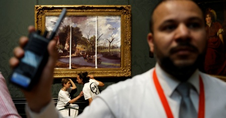 LONDRA - Due giovani al di là dei nastri di sicurezza, attaccati a un capolavoro ottocentesco che era stato coperto con una versione modificata. Ecco la scena che ha trovato l’addetto alla sicurezza della National Gallery quando ha finalmente raggiunto la sala che ospita il famoso dipinto di John Constable "The Hay Wain".