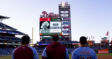 Giocatori e fan si fermano per un munito di silenzio durante la partita tra i Philadelphia Phillies e i Miami Marlins al Citizens Bank Park in Pennsylvania.