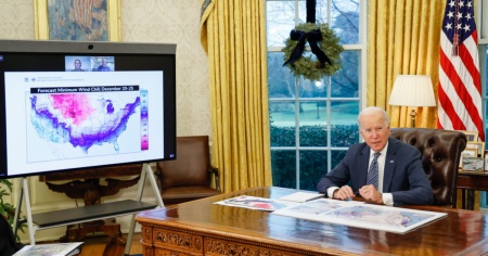 Il presidente Biden con la cartina che indica la (gelida) perturbazione.