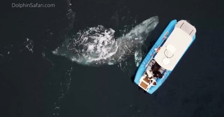 Inizialmente, il natante è stato circondato da un'enorme chiazza rossa, portando i turisti a pensare trattarsi di un evento predatorio da parte di uno squalo. Invece no. Il video ripreso dal drone e da uno smartphone mostra emergere dalle acque un cucciolo di balena grigia di 5 metri appena nato, sdraiato su sua madre mentre si scambiano effusioni.