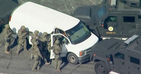 Nella tarda mattinata (ora locale), una decina di volanti ha circondato un furgoncino bianco sospetto a Torrance, a 50 chilometri dalla strage. In una conferenza stampa, lo sceriffo della contea Robert Luna ha confermato la presenza «di una persona barricata nel furgone», sottolineando però di non sapere con certezza se si trattasse del killer né quali fossero le sue condizioni. La Cnn ha riferito che l'uomo si sarebbe suicidato.