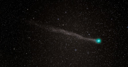 C/2022 E3 (ZTF) scintilla di verde perché il processo di assorbimento dei raggi ultravioletti da parte delle sue molecole di carbonio biatomico, composte da due atomi di carbonio, rilascia una luce verde.