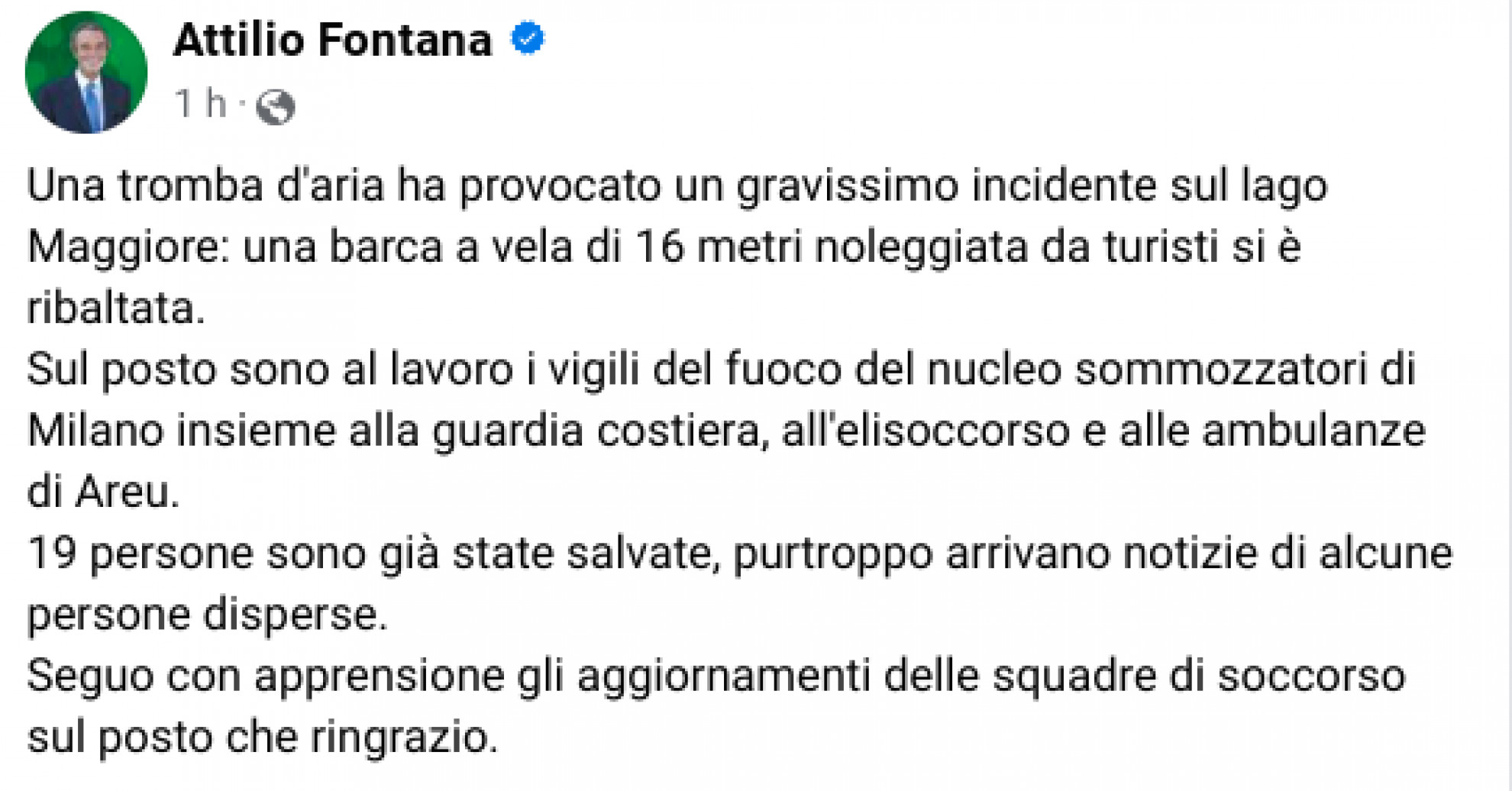 Sul posto sono al lavoro i vigili del fuoco del nucleo sommozzatori di Milano insieme alla guardia costiera, all'elisoccorso e alle ambulanze di Areu. «Seguo con apprensione - ha concluso Fontana - gli aggiornamenti delle squadre di soccorso sul posto che ringrazio». Le operazioni di ricerca, però, sono rese molto complicate dal buio.