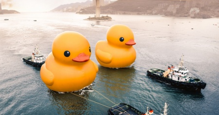"Double Ducks by Florentijn Hofman", è il nome del progetto artistico che ben descrive la doppia gioia di chi potrà ammirare galleggiare i due "mega-gonfiabili" al porto naturale di Victoria Harbour, a partire dal 10 giugno e per due settimane, sotto il patrocinio dell'ente Turismo del territorio autonomo a Sud della Cina.