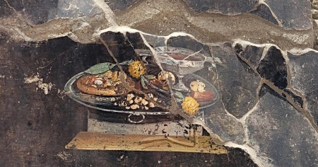 Come spiegano gli archeologi del Parco Archeologico di Pompei, si suppone che accanto a un calice di vino, posato su un vassoio di argento, sia raffigurata una focaccia di forma piatta che funge da supporto per frutti vari (individuabili un melograno e forse un dattero), condita con spezie o forse piuttosto con un tipo di pesto (moretum in latino), indicato da puntini color giallastro e ocra.