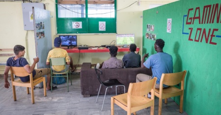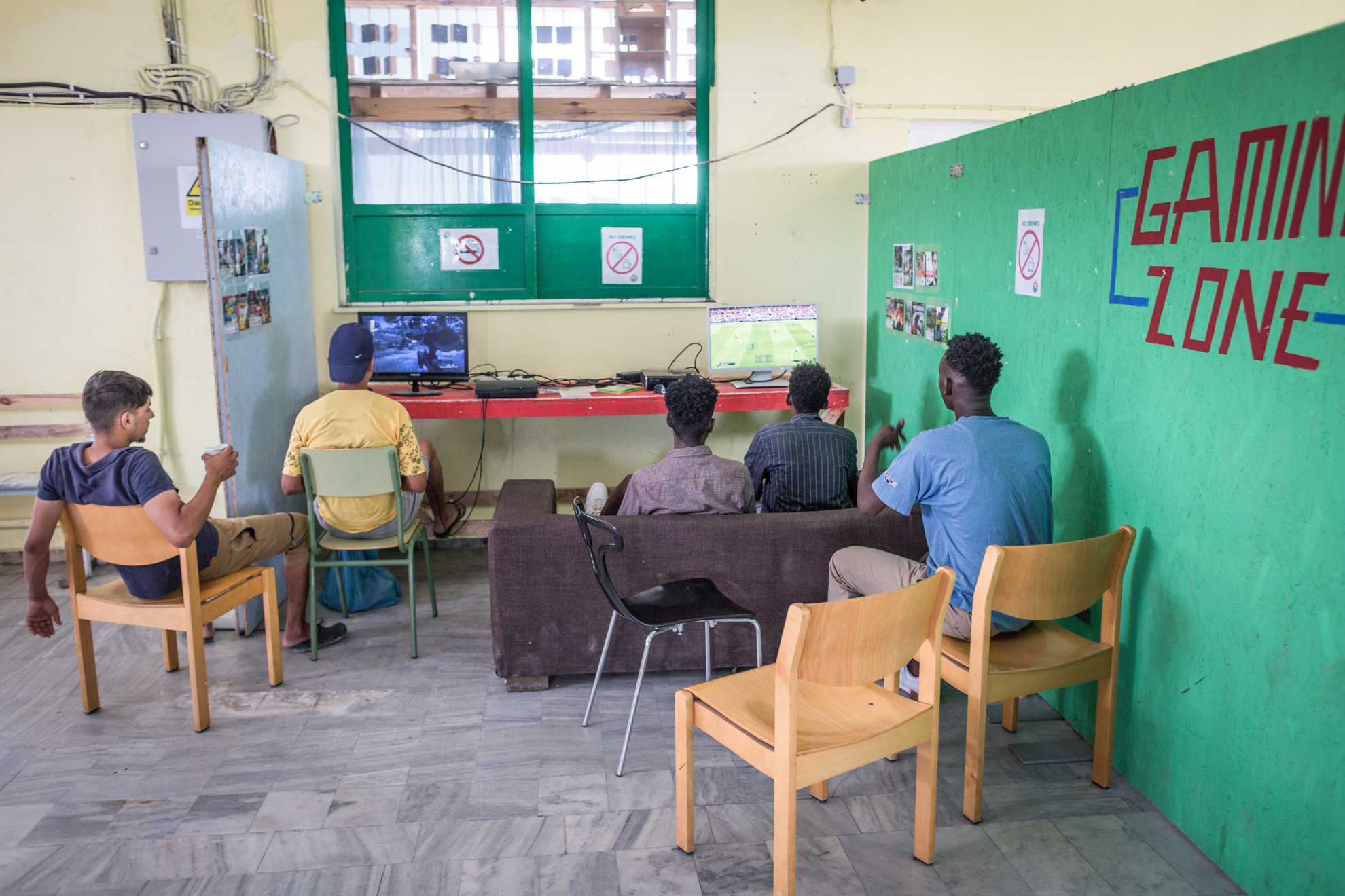 Dai tavolini all’ombra, oltre gli alberi, si vedono più in basso le strutture del centro di Mavrovouni, tende, container e moduli, chiuse da un’alta recinzione, in parte da un muro, strette a ridosso del mare. «Per noi è una scelta politica quella di non lavorare all’interno dei centri» Spiega Silvia Lucibello, field coordinator di Paréa, centro comunitario che a Lesbo offre spazio e supporto a numerose piccole Ong e progetti, ed è uno dei principali riferimenti per i rifugiati quando arrivano sull’isola. Le persone qui vengono per distrarsi e prendere un caffè, per seguire lezioni di inglese, per giocare a basket, per una visita all’infermeria. Da maggio Paréa è diventato anche punto di consegna per la distribuzione dei generi alimentari promossa da Siniparxi. «Si tratta di un bisogno primario – dice Silvia – non si possono lasciare centinaia di persone senza cibo. Consegnando prodotti alimentari cerchiamo anche di sostenere l’autonomia delle persone, che possono cucinare quello che desiderano. Ma la nostra iniziativa è una risposta a un’emergenza, non può diventare la normalità. Le cose devono cambiare.»