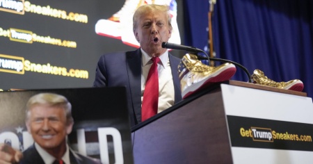 Durante lo Sneaker Con l'ex presidente degli Stati Uniti, Donald Trump, ha preso il palco per presentare la sua ultima creazione: una linea di scarpe da ginnastica alte in lamé dorato. Queste presentano la bandiera americana sul retro sopra la sua iniziale "T", e sono state commercializzate con il nome "The Never Surrender High-Tops".
