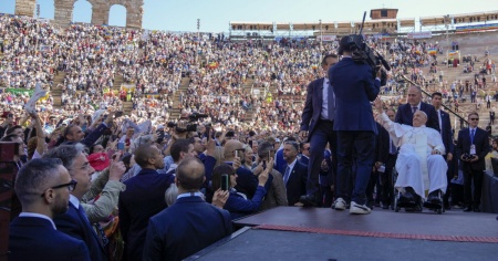 A Verona per l'incontro "Arena di Pace", il pontefice ha rivolto un appello: «Dobbiamo fare qualcosa per far finire queste guerre».