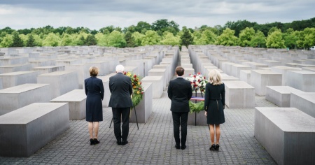BERLINO - Il presidente francese Emmanuel Macron ha deposto oggi una corona di fiori davanti al Memoriale degli ebrei assassinati nel genocidio del nazionalsocialismo a Berlino, insieme al Presidente tedesco Frank-Walter Steinmeier.