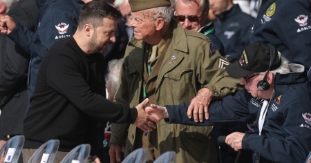 OMAHA BEACH - Abbracci e un affettuoso scambio di battute tra un veterano dello sbarco in Normandia ed il presidente ucraino Volodymyr Zelensky durante le celebrazioni per gli 80 anni del D-Day a Omaha Beach.