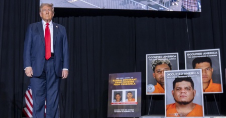 Sul palco di Aurora l'ex presidente è stato accompagnato da gigantografie di quelli che il tycoon ha definito «immigrati criminali» dal Venezuela.