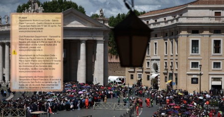 Migliaia di smartphone hanno iniziato a squillare e vibrare alle 13.11. Anche all'interno della Basilica. «Dipartimento Protezione Civile - Saluto Papa Francesco. Orario chiusura accesso Piazza San Pietro ore 17 del 25 aprile». Questa la comunicazione, inviata mediante il sistema IT-Alert, che ha colto di sorpresa tutti. «Lì per lì pensavamo a un attacco dal cielo», ha raccontato al Corriere della Sera uno dei presenti, scherzandoci un po' su, forse influenzato dalla presenza di alcuni militi dell'esercito armati di "cannone" anti-droni.
