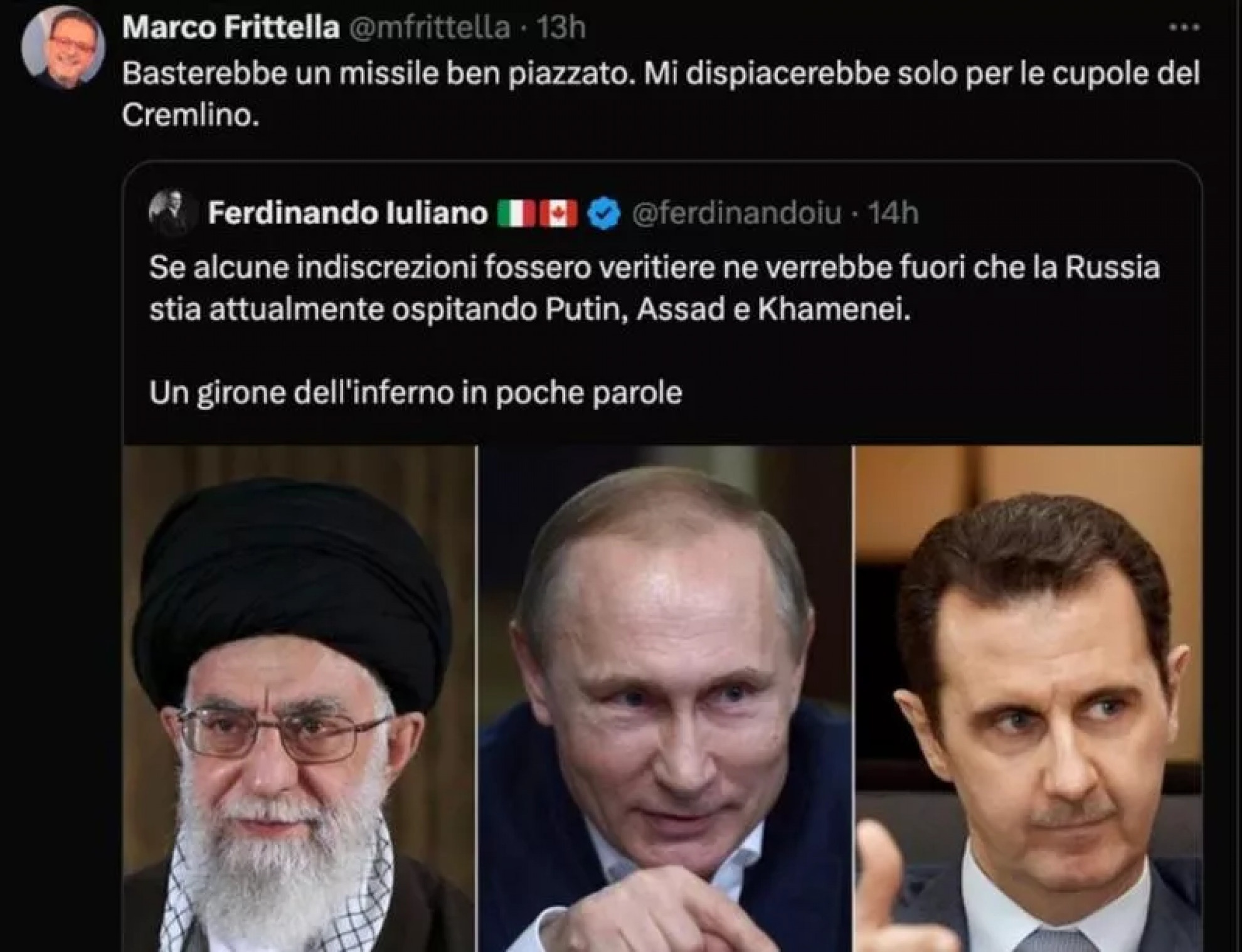 Il messaggio era apparso negli scorsi giorni sul profilo X del giornalista Marco Frittella. Lui si difende: «Sono stato hackerato».