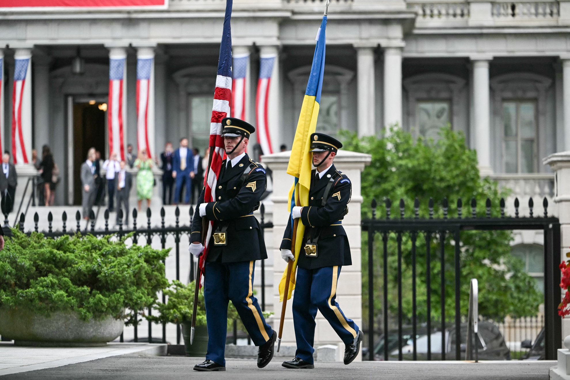 Una guardia d'onore militare statunitense porta una bandiera americana e una bandiera ucraina in vista dell’arrivo del presidente ucraino Volodymyr Zelensky davanti all’Ala Ovest della Casa Bianca, a Washington.