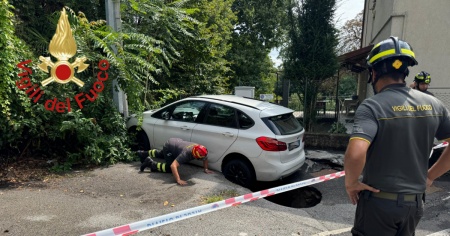 Maxi buca nell'asfalto in via Rosales, a pochi chilometri dal confine. Verifiche in corso dei pompieri.