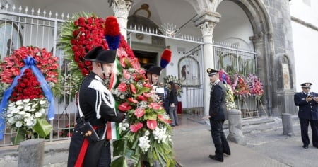 La chiesa dei Francescani è stracolma di persone giunte per omaggiare il militare, morto mentre stava compiendo un'operazione in borghese. Svariate corone di fiori, mandate dalle massime cariche istituzionali, sono state poste all'esterno del luogo di culto.