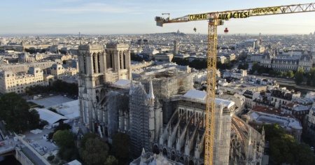 Striscione di Greenpeace sulla gru del cantiere di Notre-Dame