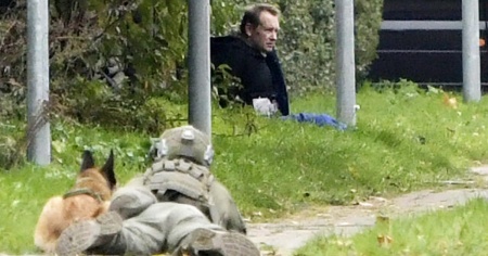 Le foto della scena ad Albertslund, Copenhagen, mostrano il 49enne seduto contro un recinto, a poche centinaia di metri dalla prigione, circondato dagli agenti armati, e con addosso ciò che sembra essere una cintura esplosiva.