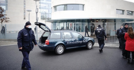 Lo riferisce l'agenzia stampa Reuters tramite i suoi fotografi presenti sulla scena. Non sembra affatto essere un banale incidente stradale: sulle fiancate della vettura sono presenti due scritte in tedesco, che affermano «Stop alle politiche di globalizzazione» e «dannati assassini di bambini e anziani».