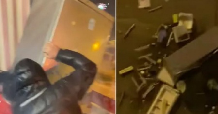 Un altro video riprende tre uomini che sollevano un frigorifero gettandolo dal balcone.