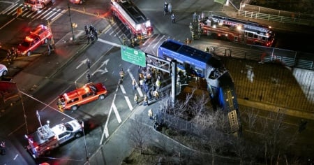 NEW YORK - Almeno otto persone sono rimaste ferite a New York dopo che un autobus è precipitato, per metà, da un cavalcavia.