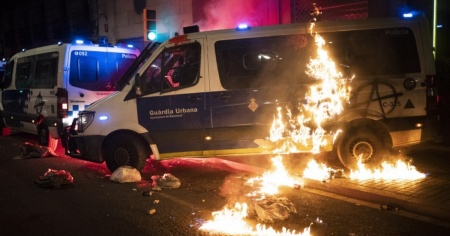 Furgoni della polizia bersagliati con le bottiglie molotov, cassonetti rovesciati e incendiati, negozi saccheggiati, banche prese di mira: la capitale catalana ha vissuto un'altra serata di scontri e tensione, con almeno 10 arresti, uno dei quali per l'incendio a una camionetta della polizia.