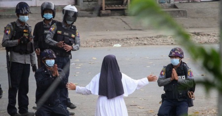 Ritrae suor Ann Rose Nu Tawng che, inginocchiata davanti a ufficiali di polizia armati nella città settentrionale di Myitkyina, chiede loro con le braccia larghe di non sparare «ai bambini» e di prendere piuttosto la sua, di vita. L'immagine della religiosa cattolica che implora le forze della giunta militare - scattata da un fotografo del Myitkyina News Journal - è diventata virale e ha conquistato numerose lodi, sia nel Paese a maggioranza buddista che nel resto del mondo.