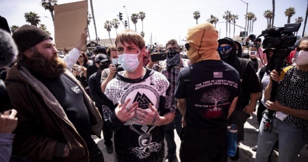 In un primo momento la polizia si è limitata a un compito di sorveglianza ma, quando la folla è arrivata a quasi 500 persone, gli agenti sono intervenuti e hanno sciolto la manifestazione, dichiarandola illegale. Tra gli organizzatori, secondo alcune fonti, c'era una frangia locale del Ku Klux Klan - il cui leader californiano è stato visto camminare tra la folla. Presenti anche gruppi anti-abortisti, sostenitori delle armi da fuoco e del gruppo di estrema destra Proud Boys, venuto agli onori delle cronache dopo l'assalto a Capitol Hill di gennaio.