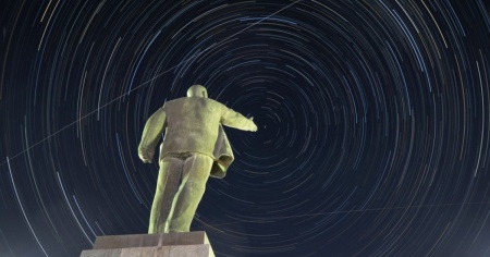 L'oribita della Stazione spaziale internazionale nel cielo del Kazakhistan. In primo piano una statua di Lenin.