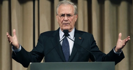 Una delle figure chiave di entrambe le guerre in Iraq, come inviato speciale per Donald Raegan prima e segretario della Difesa per George W. Bush poi, si occupò anche della strategia alla base dell'attaco preventivo all'Afghanistan dopo l'11 settembre.