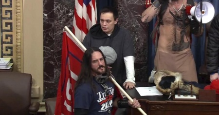 In un filmato si vede Hodgkins, 38 anni, all'interno del Senato con indosso una maglietta Trump 2020, la bandiera sulle spalle e occhiali protettivi sul collo mentre si fa un selfie con colui che è stato ribattezzato lo Sciamano. La sua condanna a Washington potrebbe fare da precedente per molte altre.
