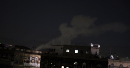 Il fumo che si solleva sulla città di Sana'a, capitale dello Yemen, dopo i raid sauditi.