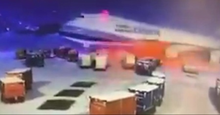 Un Boeing 747 scivola sulla pista e urta i carrelli portabagagli