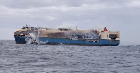 L'incendio della nave mercantile piena di auto di lusso si sta spegnendo