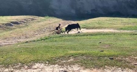 Durante la Bianchi Rock Cobbler, competizione fuoristrada di 80 miglia, che prevede il passaggio all'interno di un prato adibito al pascolo dei bovini, tre ciclisti sono stati puntati e attaccati da un esemplare non proprio pacifico.