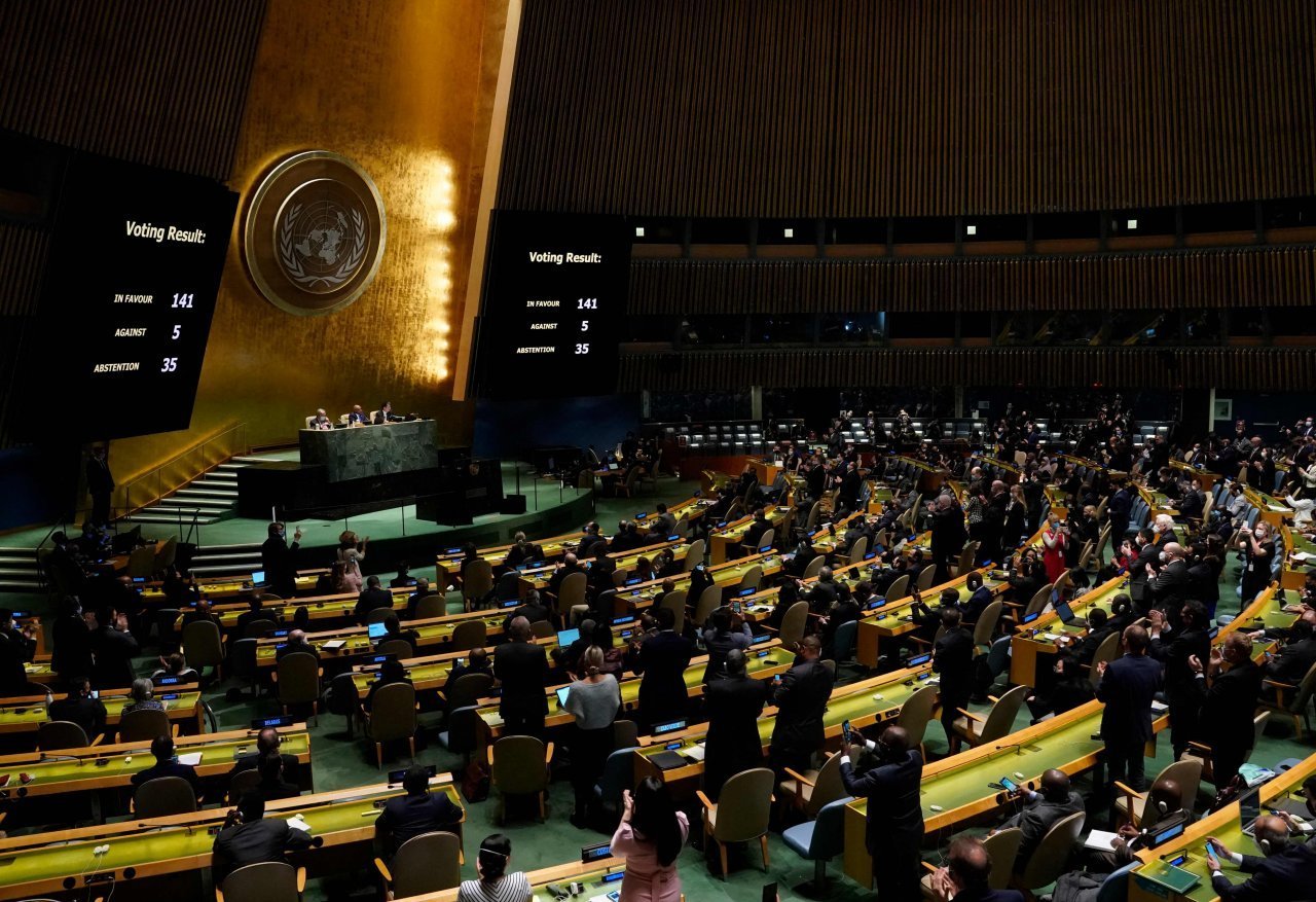 Solo cinque i voti contrari alla risoluzione di condanna della Russia da parte dell'Assemblea generale delle Nazioni unite: quello della Russia, ovviamente, al quale si aggiungono Bielorussia, Corea del Nord, Eritrea e Siria. Tra i 35 Paesi che si sono astenuti ci sono la Cina, il Sudafrica, l'India, varie nazioni asiatiche e africane, l'Armenia e Cuba. Per essere adottata, la mozione doveva essere approvata dai due terzi dei Paesi membri. L'esito è stato superiore a quella di una analoga mozione di condanna della Russia per l'annessione (incruenta) della Crimea nel 2014, che aveva ricevuto 100 sì, 11 no e 58 astensioni. Il documento non ha valore legalmente vincolante ma è politicamente molto significativa. (fonte ats ans)