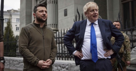 Boris Johnson durante la sua visita al presidente ucraino Volodymyr Zelensky.
