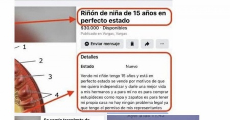 «Marielys del Carmen Yedra è stata arrestata (nello stato di Portuguesa dopo aver offerto illegalmente un rene per 20.000 dollari sul sito Marketplace», scrive il magistrato in un tweet mostrando l'annuncio, in cui si legge che il rene proviene da una «ragazza di 15 anni in perfette condizioni di salute».