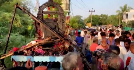 L'incidente è avvenuto quando l'altare a forma di torre, che veniva fatto uscire dal tempio di Appar Madan, ha urtato il cavo dell'alta tensione, si è rovesciato a terra e ha preso fuoco investendo le vittime.