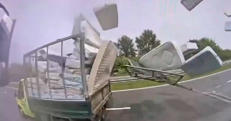 Un camioncino che trasportava un carico di materassi, ne ha persi una ventina che hanno "preso il volo", sfondando la griglia di protezione posteriore e invadendo le corsie.