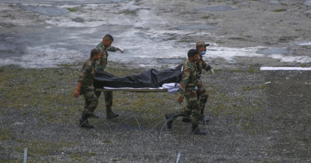 I militari portano via uno dei morti in seguito al nubifragio.