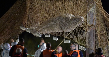 Intorno alle 4 del mattino, dopo sei ore di operazioni, il cetaceo del peso di quasi 800 kg e il cui stato di salute era ritenuto «allarmante» è stato sollevato in una rete trainata da una gru e adagiato su una chiatta, dove è stato subito curato da una dozzina di veterinari vestiti con tute bianche.