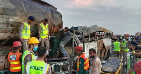Le fiamme hanno ridotto l'autobus ad uno scheletro carbonizzato, hanno detto i soccorritori. Incidenti stradali mortali sono frequenti in Pakistan a causa di strade dissestate, veicoli malridotti e conducenti che guidano in modo spericolato. Nel 2015, 62 persone morirono in un incidente che coinvolse un pullman e un'autocisterna nella provincia meridionale del Sindh.