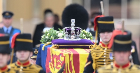 Sulla bara, coperta dal drappo dello stendardo reale, spicca la Corona Imperiale di Stato che Elisabetta indossò nel giorno dell'incoronazione solenne nel 1953, con accanto una corona di fiori scelti tra i suoi preferiti nei giardini del castello di Windsor e della residenza scozzese di Balmoral.