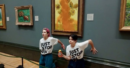 I due fanno parte del movimento "Just Stop Oil" e, come diversi attivisti per il clima in tutto il mondo, sperano di veicolare il messaggio dell'urgenza climatica sfregiando dei pezzi d'arte importanti, in questo caso i Girasoli di Van Gogh. Ma la reazione del pubblico, come si sente nell'audio del video, è una sola: «O mio dio!».