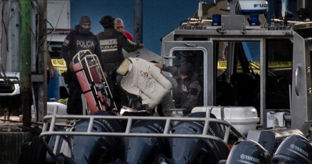 Il personale della Guardia Costiera scarica dalla nave parte di un sedile e altri oggetti trovati durante la ricerca di un piccolo aereo precipitato al largo di Puerto Limon