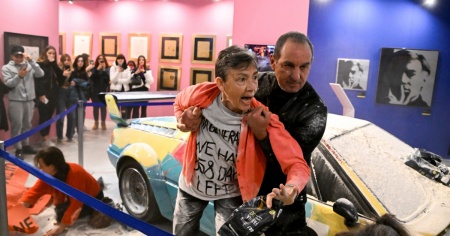 Dopo aver ricoperto di farina un’automobile customizzata da Andy Warhol, senza protezioni, hanno iniziato a gridare: «Bisogna occuparsi del clima: è una questione di bene comune, della nostra società. Ci saranno migrazioni ovunque, abbiamo perso un quarto del nostro raccolto, non ci sarà più cibo e acqua, c’è un collasso ecologico e climatico in corso».