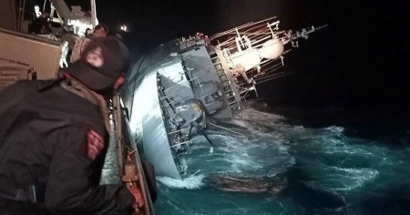I funzionari hanno detto che la nave è affondata dopo aver imbarcato acqua. Sembrerebbe che lo scafo si sia allagato mandando in cortocircuito la sua sala macchine. L’equipaggio ha lottato per mantenere il controllo della nave che si è inclinata su un fianco prima di affondare intorno alle 23:30 ora locale di domenica (16:30 GMT).