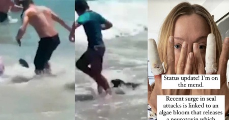 Le immagini riprese da un passante mostrano un cucciolo di foca rincorrere e mordere a più riprese un bambino scatenando il panico tra i bagnanti. Tra le vittime dell’animale figura anche l’attrice americana Loulou Taylor, morsa seti volte. Attraverso una storia su Instagram l’attrice ha mostrato sconsolata le dita fasciate.
